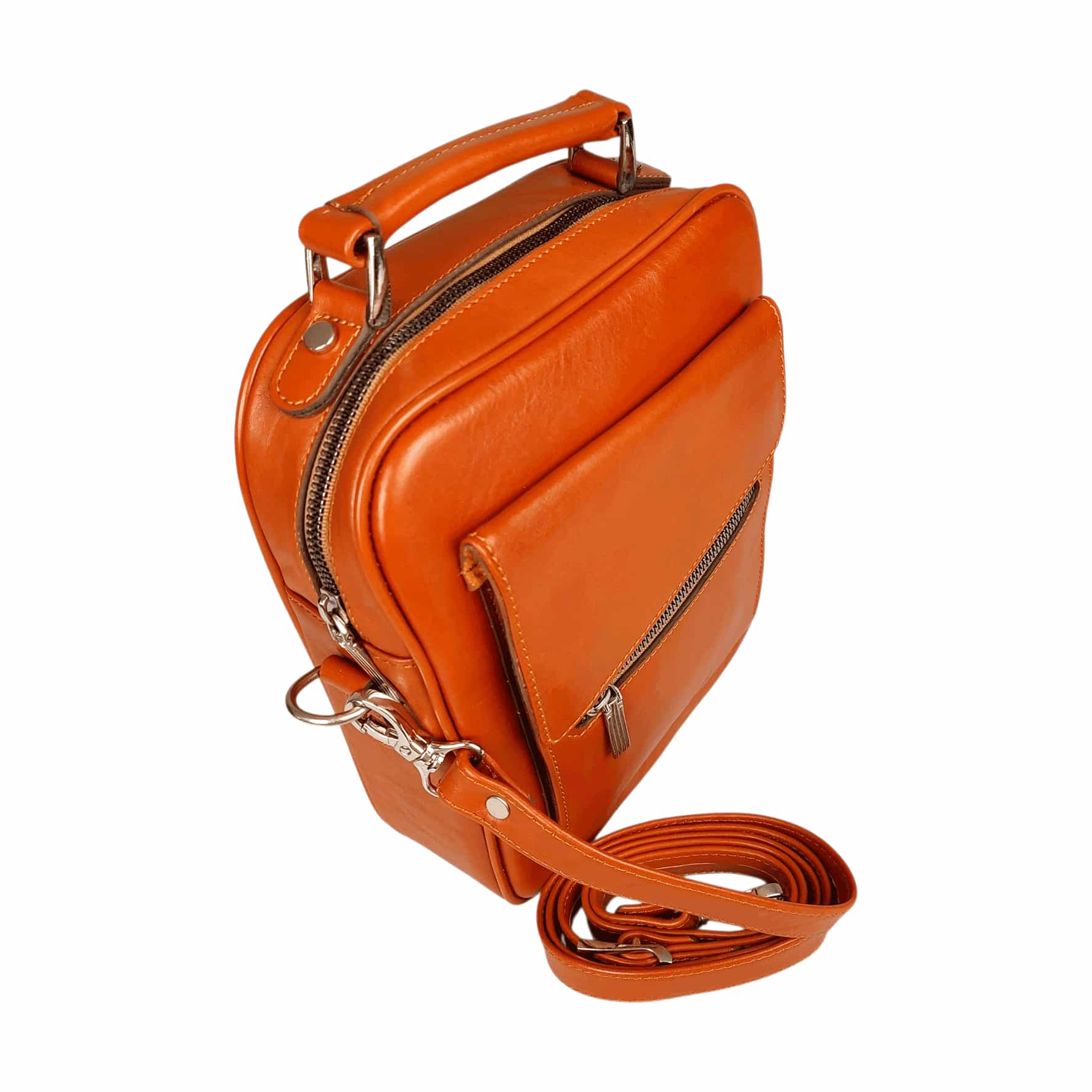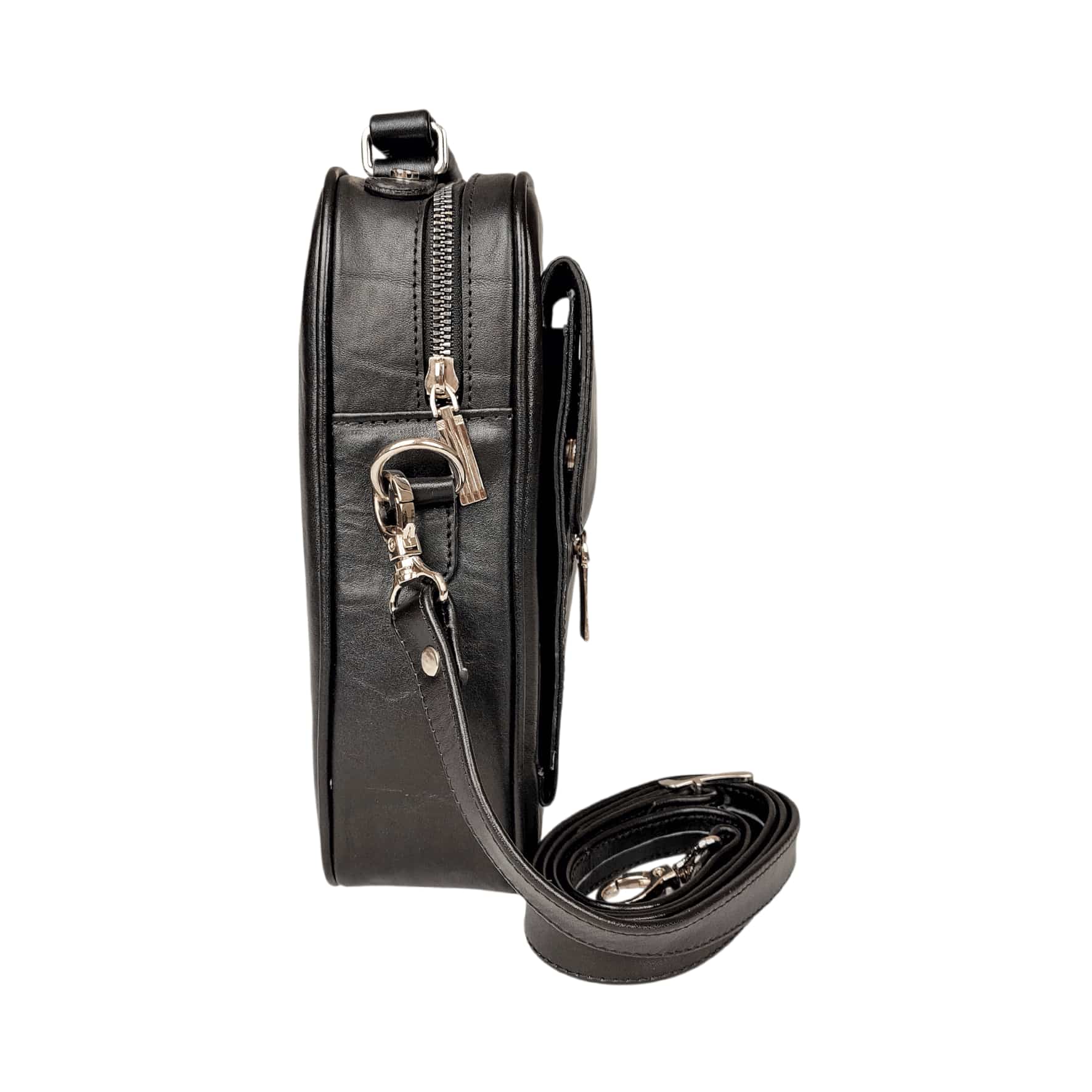 دارای دسته چرمی محکم برای حمل دستی و بند بلند قابل تنظیم برای استفاده دوشی.