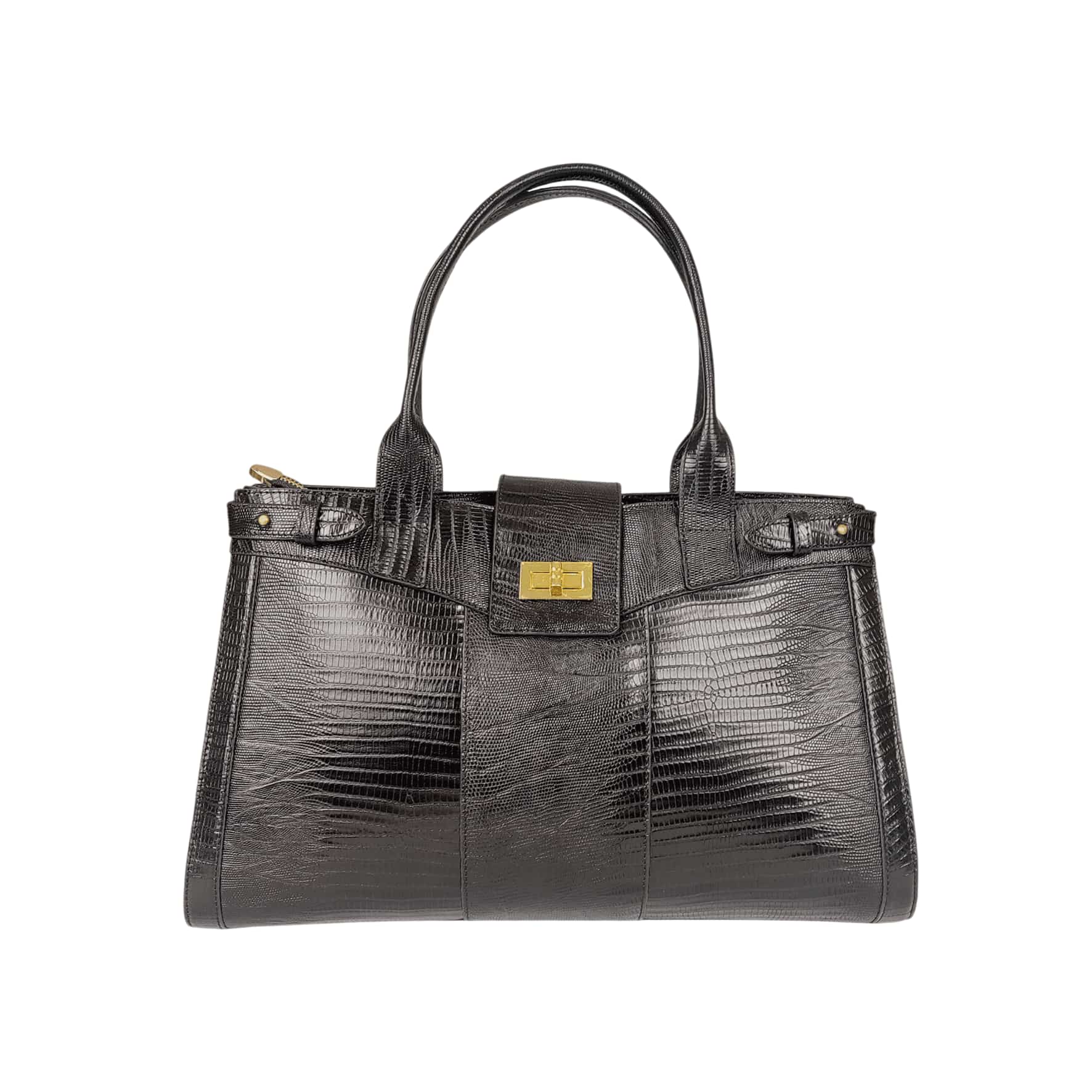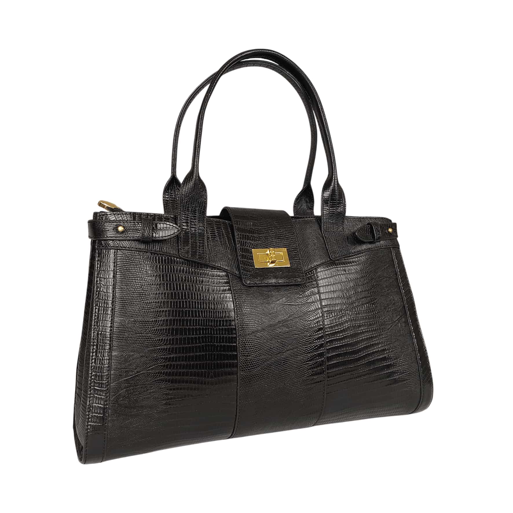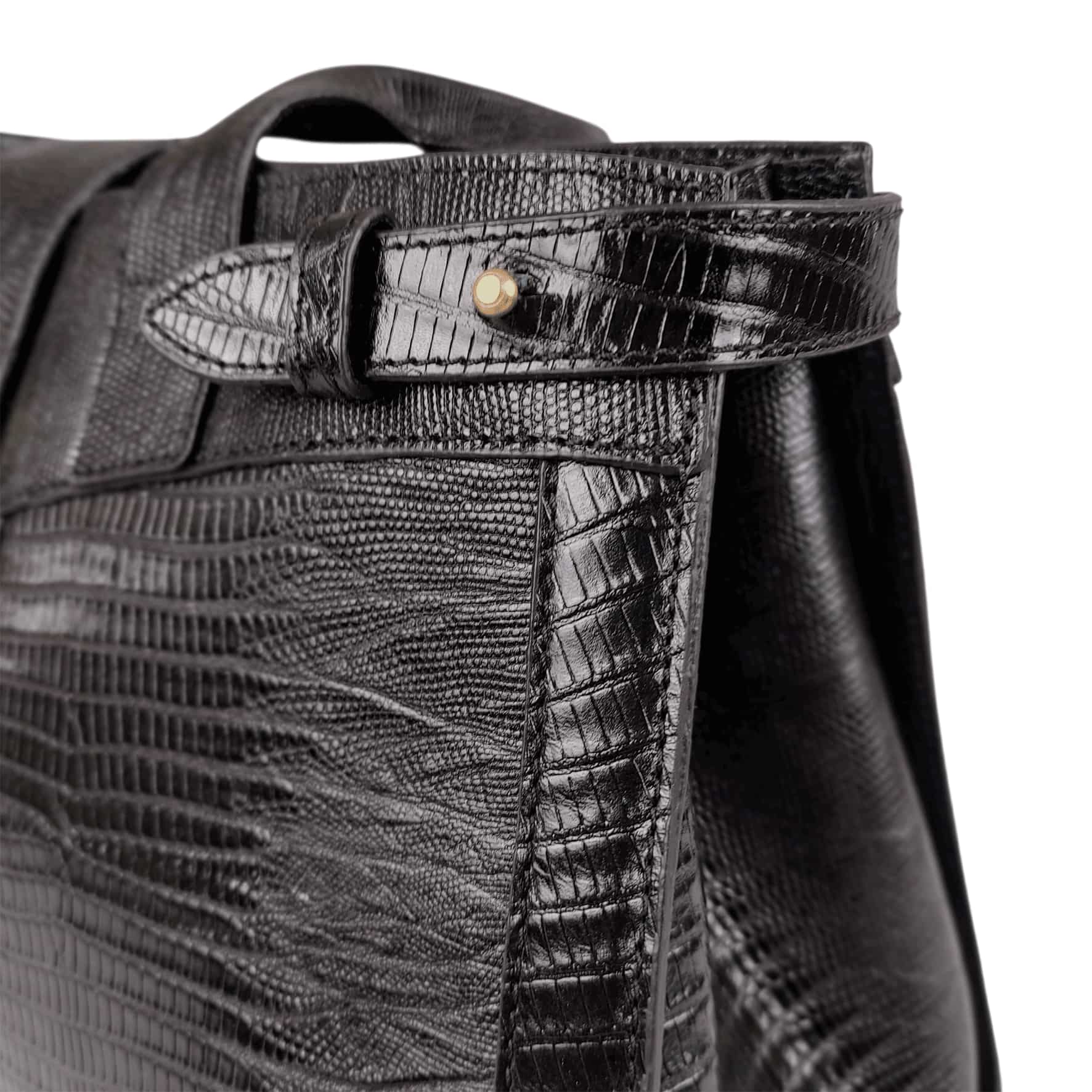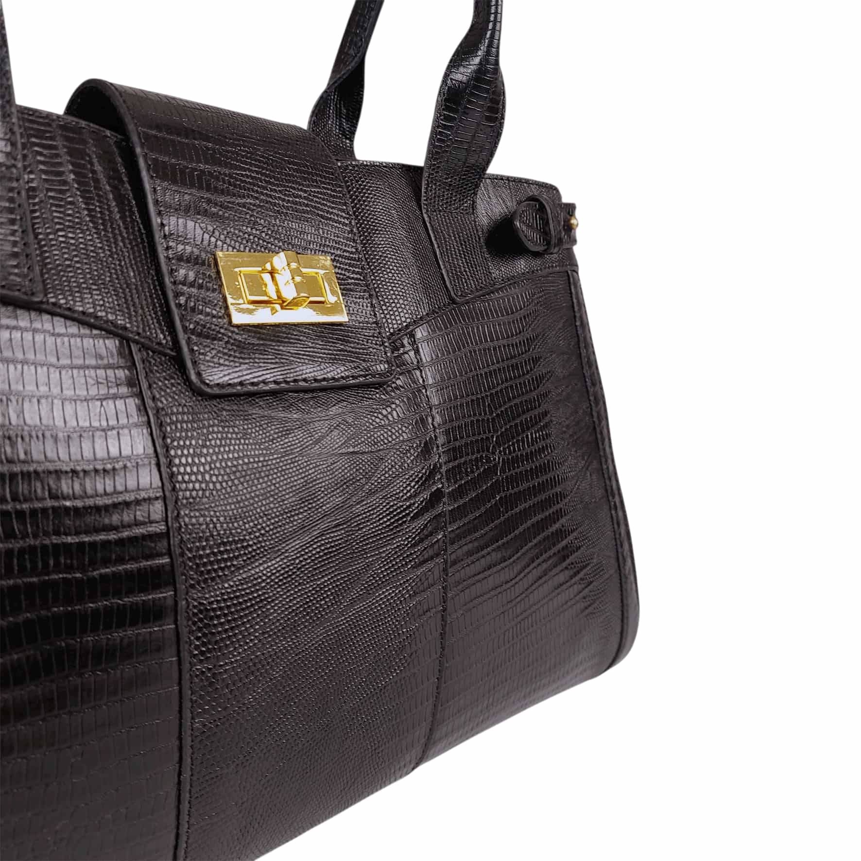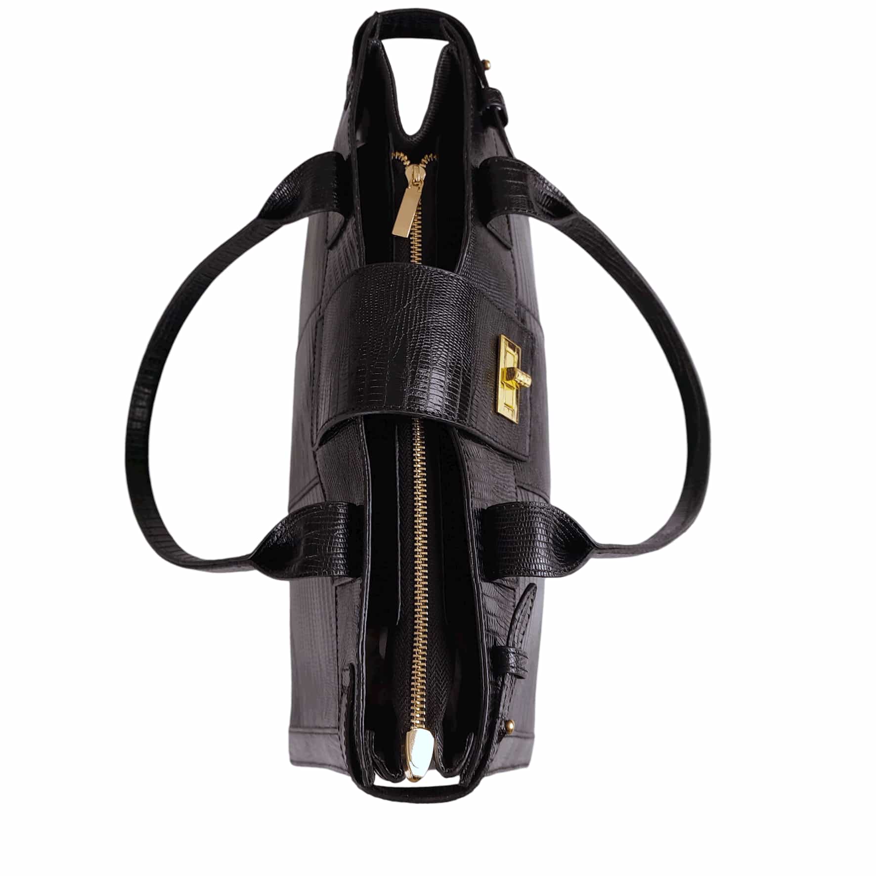 این کیف از چرم طبیعی گاوی طرح لیزارد ساخته شده است که جلوه ای خاص و لوکس به آن می دهد. رنگ مشکی آن با جزئیات طلایی ترکیب شده تا جلوه ای شیک و مجلسی خلق کند.